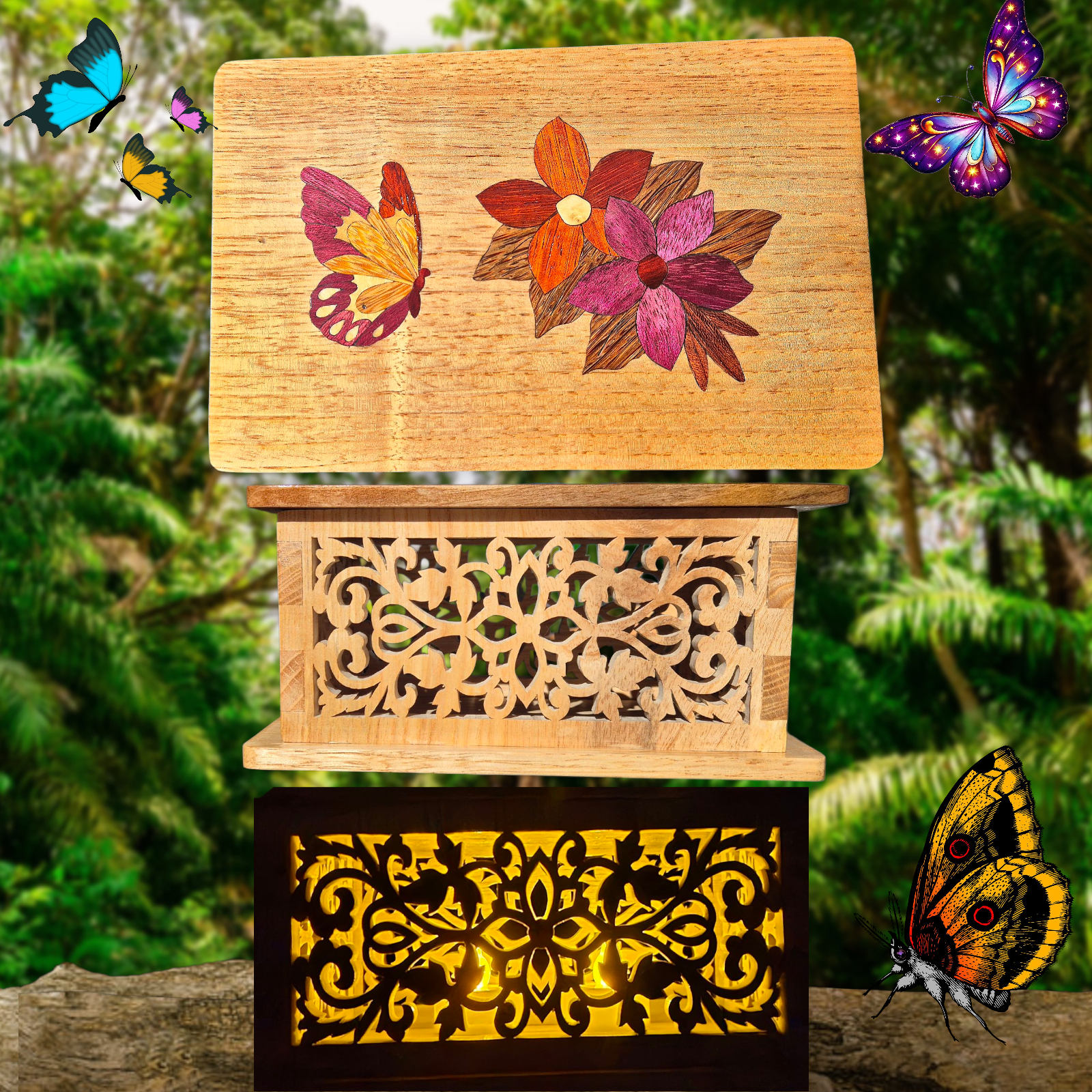 Boite en bois naturel +2 bougies offerte "Papillon et ses 2 fleurs"