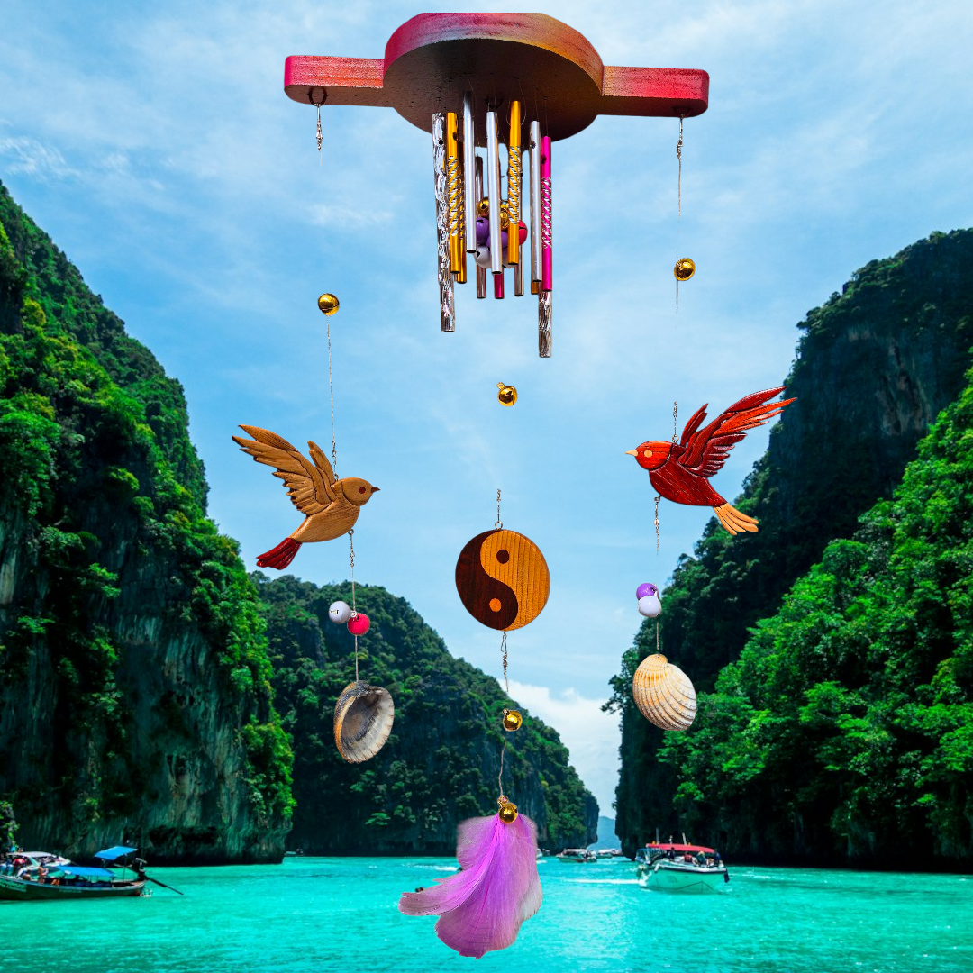 Carillon fait main avec bois du monde entier, coquillages naturels et clochettes colorées.