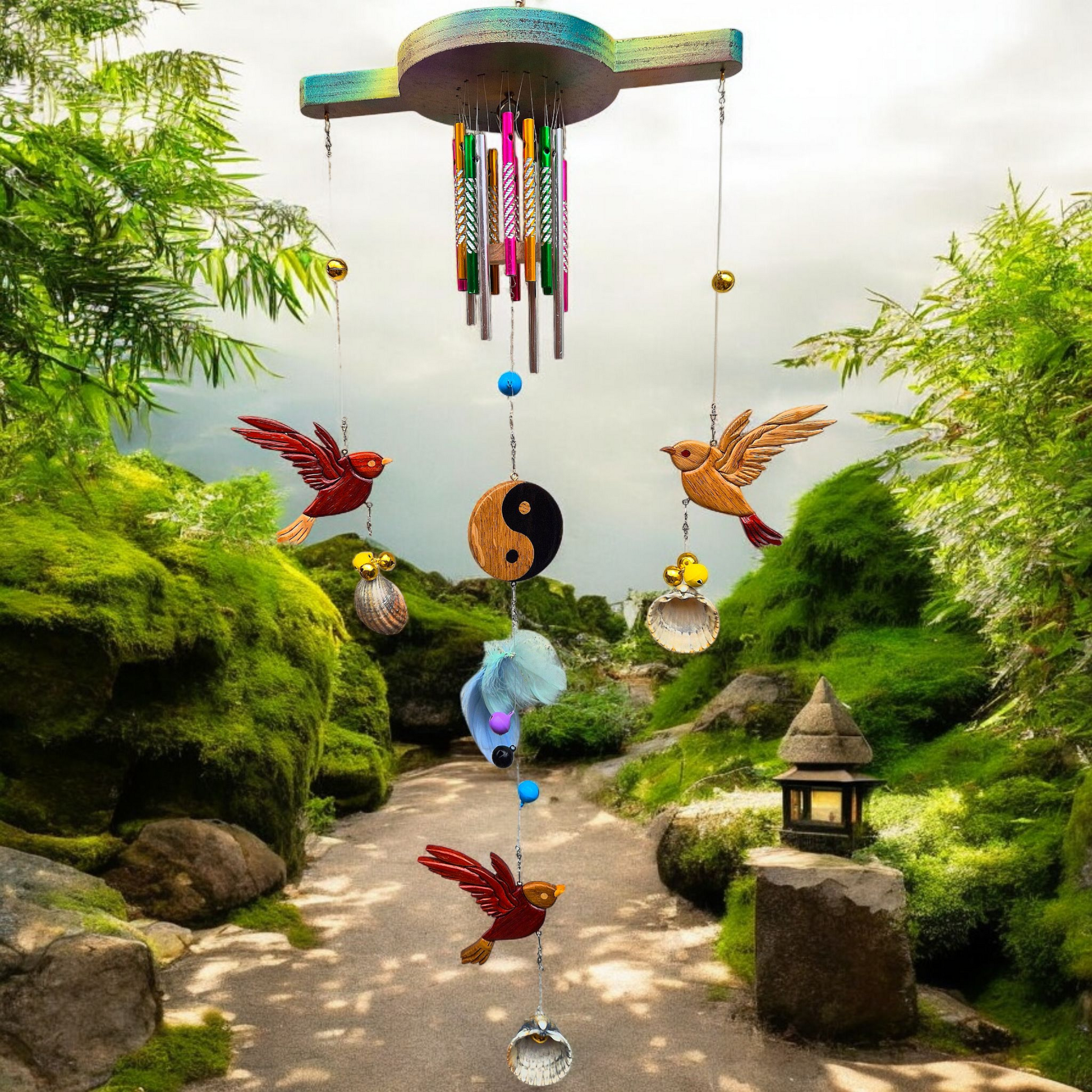 Carillon bois naturel "Yin yang d'ébène et les 3 petits oiseaux "