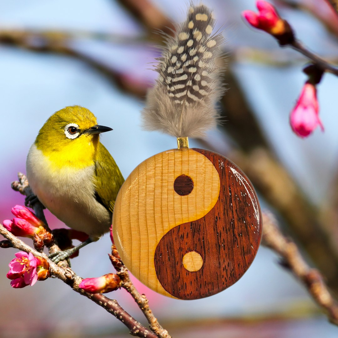 🌿 Magnet Yin-Yang en bois et petites plumes – fait main
